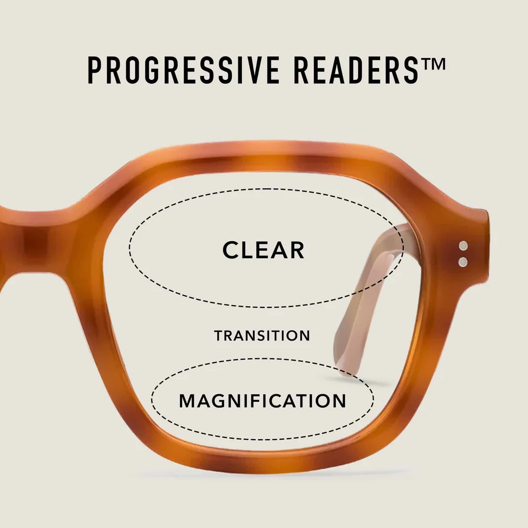 If you rely on readers, you know the drill: on for the menu, off for conversation, back on for your phone. LOOK OPTIC Progressives eliminate the irritating back-and-forth with a smooth, natural transition. Clear on top for distance, magnification below for reading. No Prescription Needed.